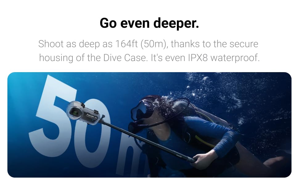 • The Insta360 X4 Dive Case allows for deep water diving up to 50M (164 ft) and provides a scratch proof lens guard for added protection.