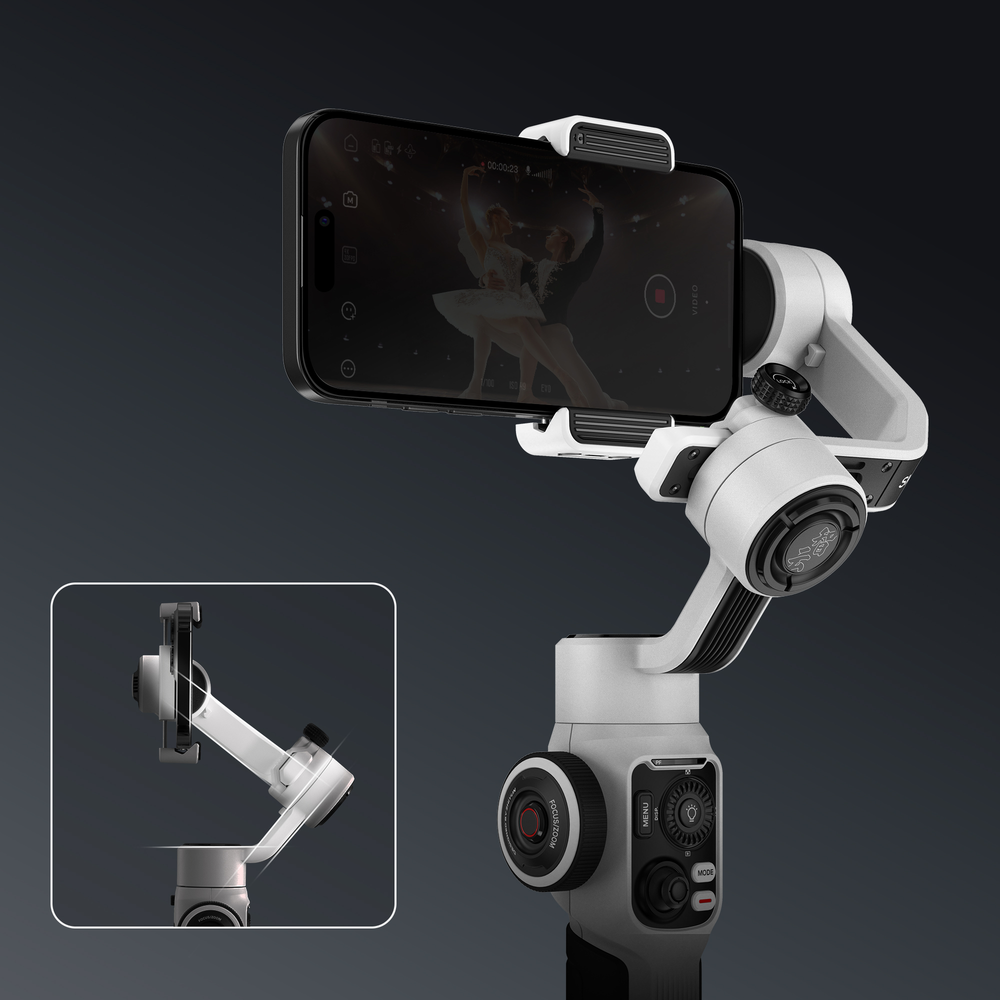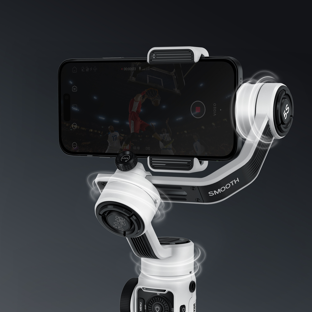 Smooth 5S stands out with its professional structure of 3 orthogonal pivot axes that bring you more possibilities with greater vision. The wider space between each axis facilitates extreme-angel shootings, allowing you to make cinematic shots without limits